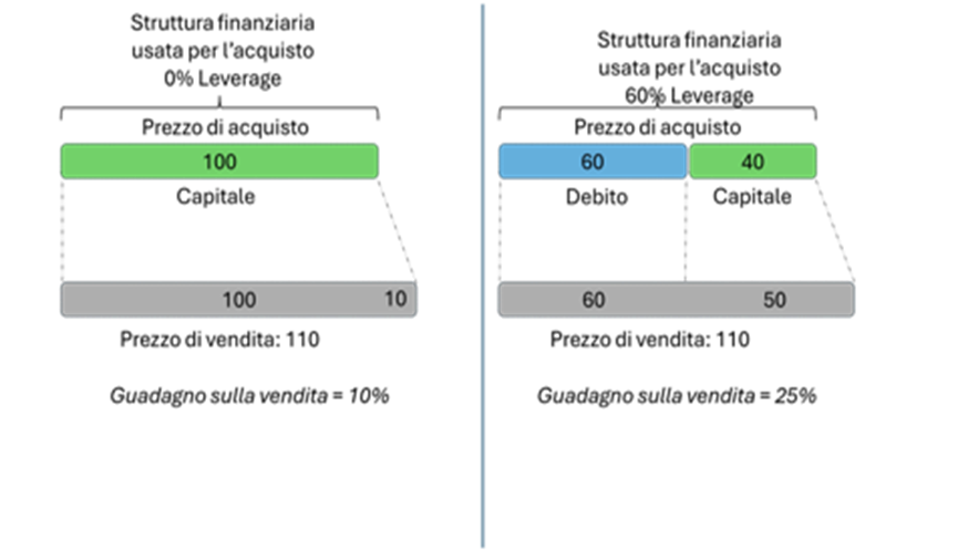 1. Le transazioni a leverage fanno crescere il prezzo dei beni d’investimento. La presenza del leverage cambia sostanzialmente sia il ritorno finanziario sia il rischio della transazione. Il semplice esempio qui sotto riportato mostra che una transazione che ha permesso un guadagno sul capitale del 10% senza leverage può permettere un guadagno del 25% con un leverage del 60%. Questo effetto, che non è intuitivo, deriva dal fatto che l’incremento di valore viene preso interamente dal capitale, poiché il valore del debito è fisso e non partecipa a tale aumento, ma si limita a ricevere gli interessi che sono pagati dai ricavi che il bene produce.